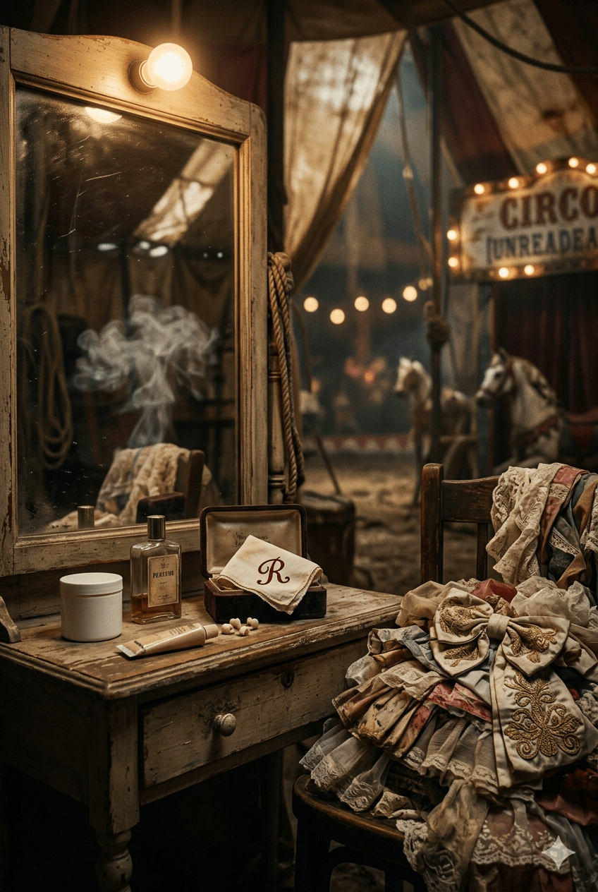 Este cuento se cuenta desde una sola voz, en primera persona, instalada en el presente del camerino mientras su protagonista se prepara para la última función. Es una narradora protagonista que no se explica: nombra los objetos —la base color piel, el frasco blanco de la fórmula serbia, el pañuelo bordado, los dientes en el frasquito de perfume— y deja que el lector arme el sentido. Me interesaba un narrador que revelara la identidad por acumulación, nunca por declaración. Así se revelan las identidades en la vida: por gestos, por prendas, por la forma en que alguien se mira en un espejo. No por anuncios.